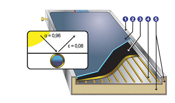 3. Συλλεκτική επιφάνεια από επιλεκτικό χαλκό. Επικαλυμμένος χαλκός με μαύρο χρώμιο πάνω σε ειδικό υπόστρωμα νικελίου, κολλημένο στους σωλήνες χαλκού με τεχνολογία υπερήχων.